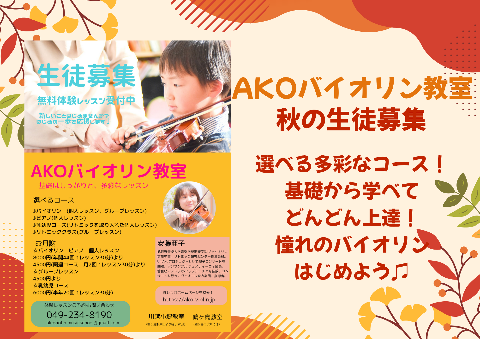 段々と肌寒い日が多くなり、秋の深まりを感じます。AKOバイオリン教室では秋の生徒募集中です!新しいことを始めたい!ずっと憧れだった!バイオリンでどうやって音が出るのかな?少しでも興味を持ってくださったら、ぜひ無料体験レッスンへお越しください!基礎から丁寧なレッスンで、体験レッスンで驚くほどきれいな音で弾いていただけます!
