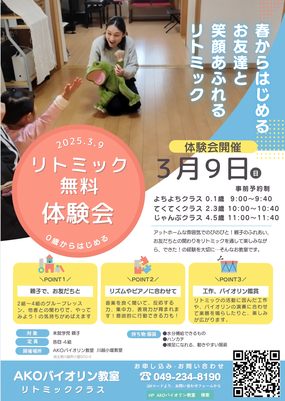 こんにちは♪AKOバイオリン教室ではリトミッククラスを開催しています。音楽やリズムに合わせて体を動かしたり、音楽表現をして、音楽の基礎を学びます。また、お友達との楽しい時間、パパママの交流の場に♪