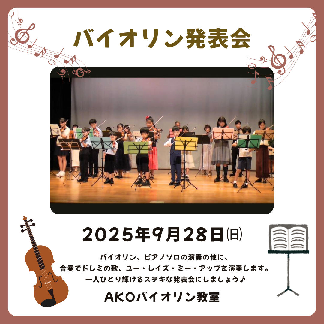 先日、9月28日にAKOバイオリン教室の発表会が無事行われ、たくさんの生徒さんにご出演いただきました。